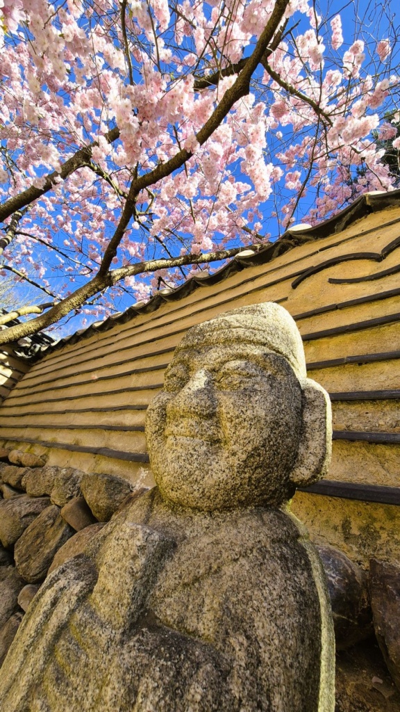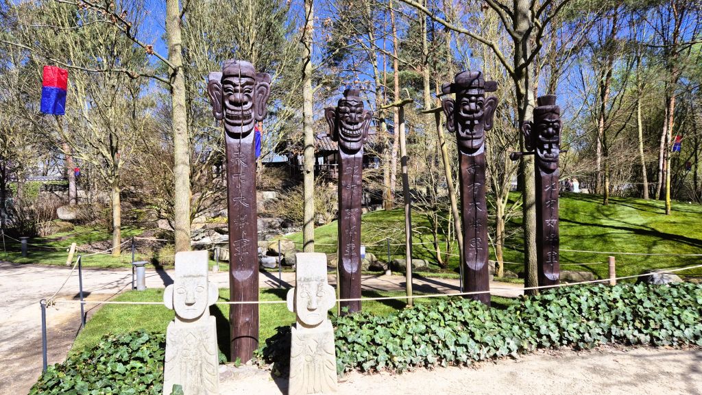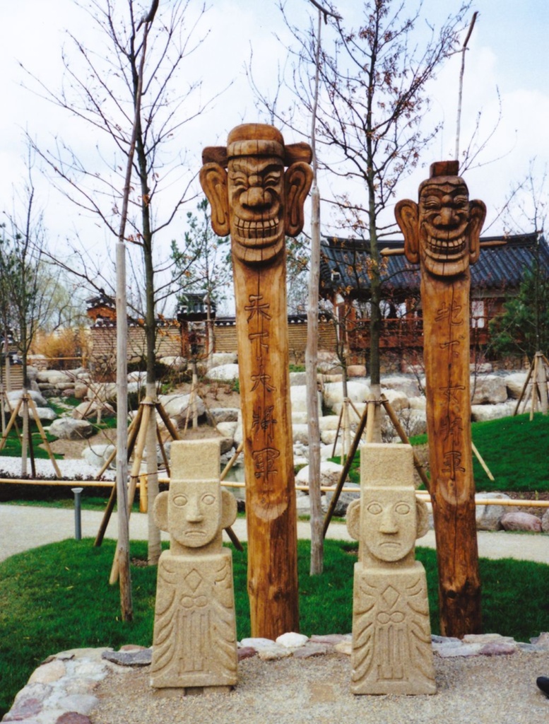 Charakteristisch für den Koreanischen Garten sind verschiedene Figuren aus Holz und Gestein, eine Art von Totempfählen, die auf eine koreanische Tradition aus der Welt der Geister und Schamanen zurückgehen und als Schutzgeister dienen sollen. Diese „Zang Sung“ genannten geschnitzten Totems werden paarweise, also mit einem weiblichen (Ritterin der Erde) und einem männlichen (Ritter des Himmels) Schutzgeist dargestellt, an die man sich mit seinen Wünschen wenden kann. Kleinere Figuren – „Buk Su“ genannt – sollen vor Feuer, Wasser, Epidemien oder anderem Unglück schützen. Auf Stangen montierte vogelartige Gebilde „Sot Dä“ sollen als Boten die Gebete der Menschen in die Welten der Geister tragen. Diese Geister existieren in der Vorstellungswelt der Schamanen gleichsam in einer Parallelwelt zu der Welt, in der wir Menschen leben.