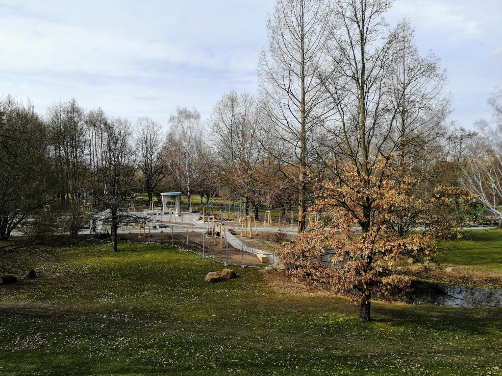 Die Bauarbeiten für den neuen Kinderspielplatz „Konrad in den Blumenwipfeln“ neigen sich dem Ende zu. Rollrasen ist verlegt, diverse Klettergeräte werden gerade installiert: