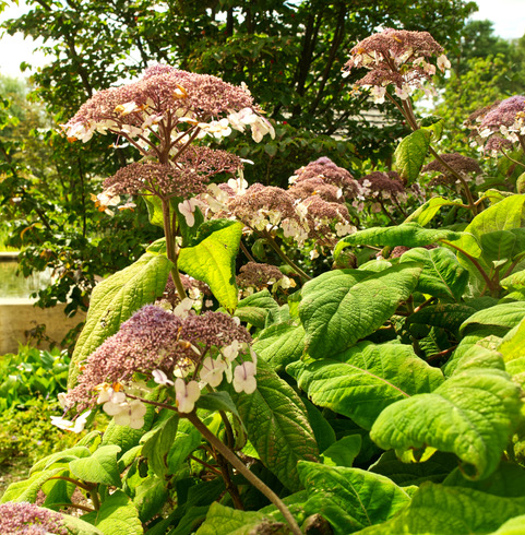 Die großen Blütenstände der Hortensien machen sie zu beliebten Blütensträuchern. Am bekanntesten sind die Garten-Hortensien mit ihren vielen Sorten in weiß, rosa und blau. In den Gärten werden zunehmend auch die weniger domestizierten Arten, darunter die Samt-Hortensie, gepflanzt.