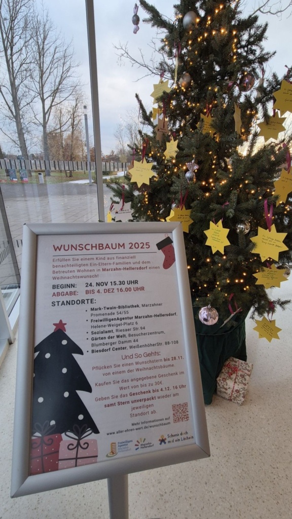 Wunschbaum 2025 – Erfülle einem Kind aus Marzahn-Hellersdorf einen Weihnachtswunsch. Auch im Besucherzentrum der Gärten der Welt steht in diesem Jahr wieder ein Wunschbaum.