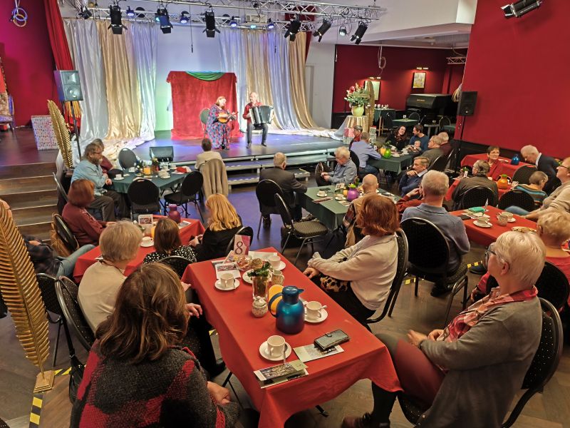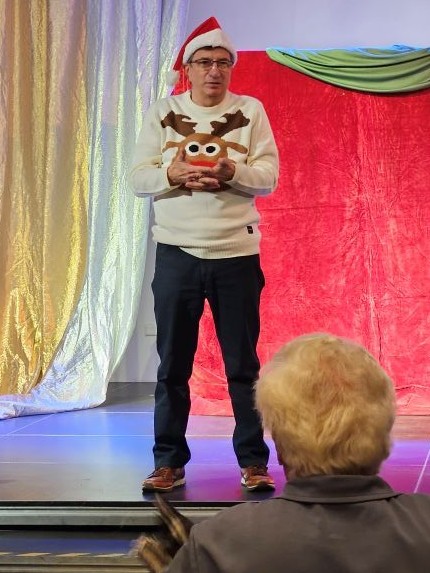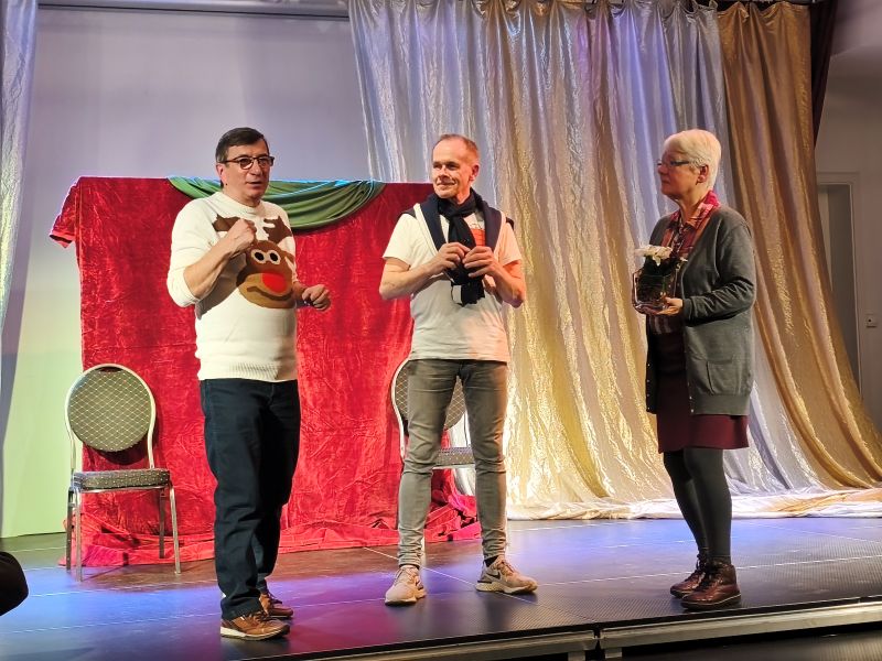 Natürlich blieb danach noch genügend Zeit, um sich an den Tischen bei einem Glas Wein über dieses und jenes auszutauschen, sei es über die durchweg gelungenen Veranstaltungen des abgelaufenen Jahres, über die Arbeit im Verein oder über ganz Privates. Und bevor alle wieder in die Dezemberkälte (ja wirklich!) mussten, haben wir noch dem engagierten Team der Grünen Bühne Hellersdorf unseren Dank abgestattet. Wer dieses Theaterchen noch nicht kennt: Ein Besuch lohnt sich! Hier der Link: https://www.gruene-buehne.com/