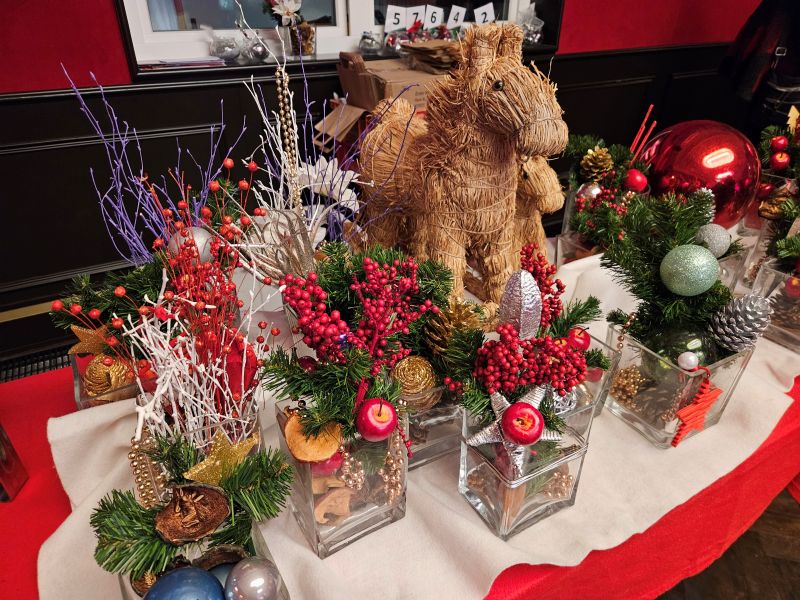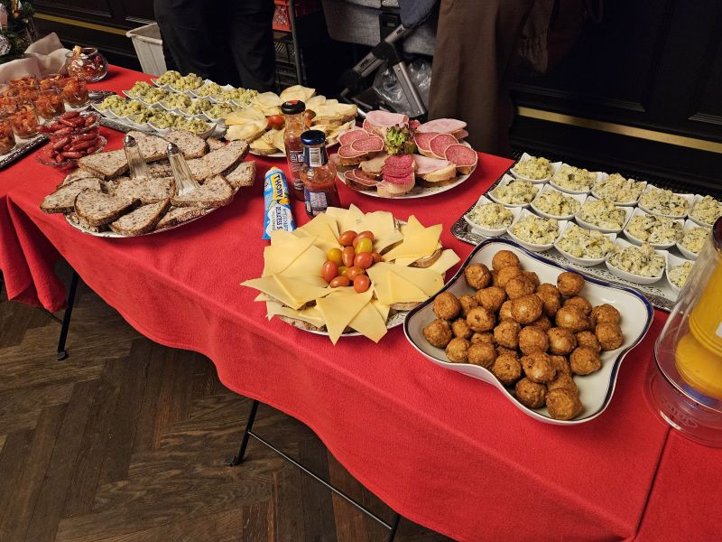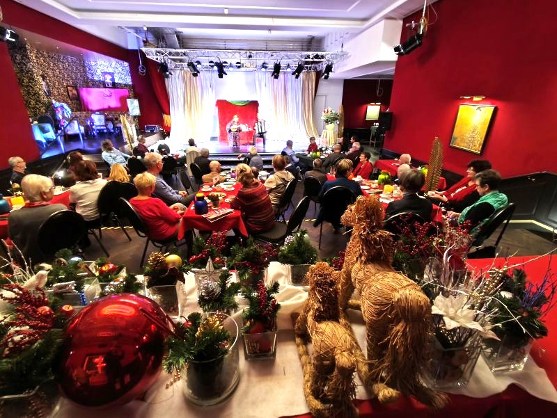 Mit diesem Veranstaltungsort, den wohl die Wenigsten kennen, haben wir wieder mal etwas Neues ausprobiert – Regina Kittler hatte es uns vor einer Weile empfohlen, Gisela und Hilka haben es nun organisiert. Und wie waren wir alle angetan von dieser schönen Location wie auch von den netten Leuten, die dort für unser leibliches Wohl in angenehmem Ambiente gesorgt haben! Kaffee und weihnachtliches Gebäck auf den Tischen und die wunderschöne Tischdekoration, liebevoll individuell handgefertigt von Martina, sorgten für festliche Stimmung bei den fast 40 Vereinsmitgliedern und Gästen. Auch das dekorative Kalte Buffett ließ keine Wünsche übrig.